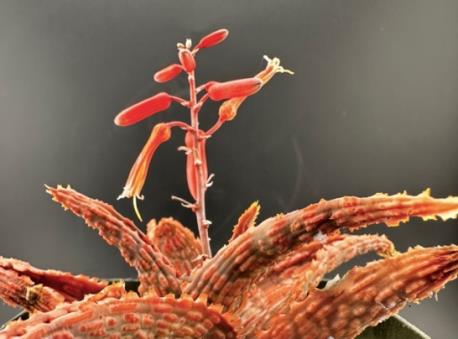This striking aloe’s leaves are shades of red to green with raised range-red ridges. Orange colored teeth line the edges of the leaves. It can be grown in full sun to light shade. The blooms are one feet tall and this plant has deep coral flowers.