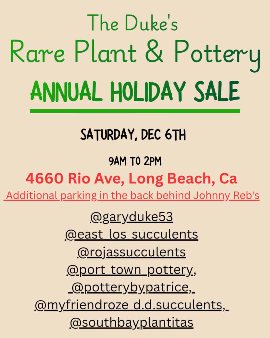 Gary Duke's 4660 Rio Ave., Long Beach, CA, United StatesThe Duke of Long Beach invites you to a: Gary Duke's Plant & Pottery Sale Saturday, December 6, 2025 4660 Rio Ave, Long Beach, CA 90805 9:00 am – 2:00 pm Additional parking behind Johnny Reb’s Restaurant. (Can also enter from back of Johnny Reb’s parking lot) Watch my Instagram: @garyduke53